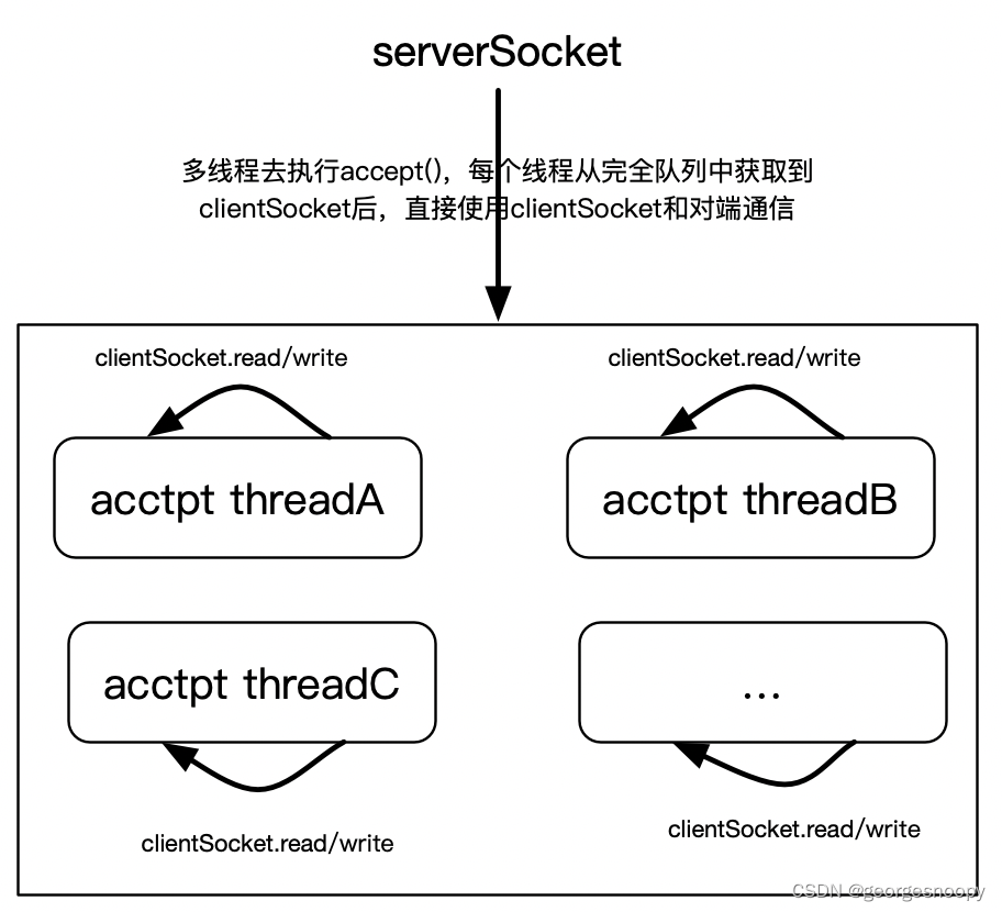 这种方式的问题就在于 accept() 是单线程的,如果网络并发非常大,以至于单程处理不过来,那么客户端的链接请求完成后,就会在完全队列中挤压,极端情况就是完全对了满了,已经链接上来的客户单通信延迟增大,而再有客户端连接请求,则会失败。