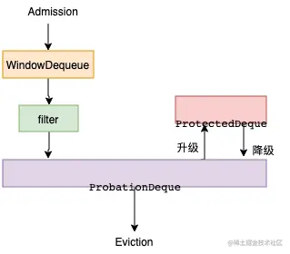 对于长期保留的数据,W-TinyLFU 使用了分段 LRU 策略。起初,一个数据项存储被存储在试用段(ProbationDeque)中,在后续被访问到时,它会被提升到保护段(ProtectedDeque)中(保护段占总容量的 80%)。保护段满后,有的数据会被淘汰回试用段,这也可能级联的触发试用段的淘汰。这套机制确保了访问间隔小的热数据被保存下来,而被重复访问少的冷数据则被回收。 - 读写优化 , 淘汰时 异步操作