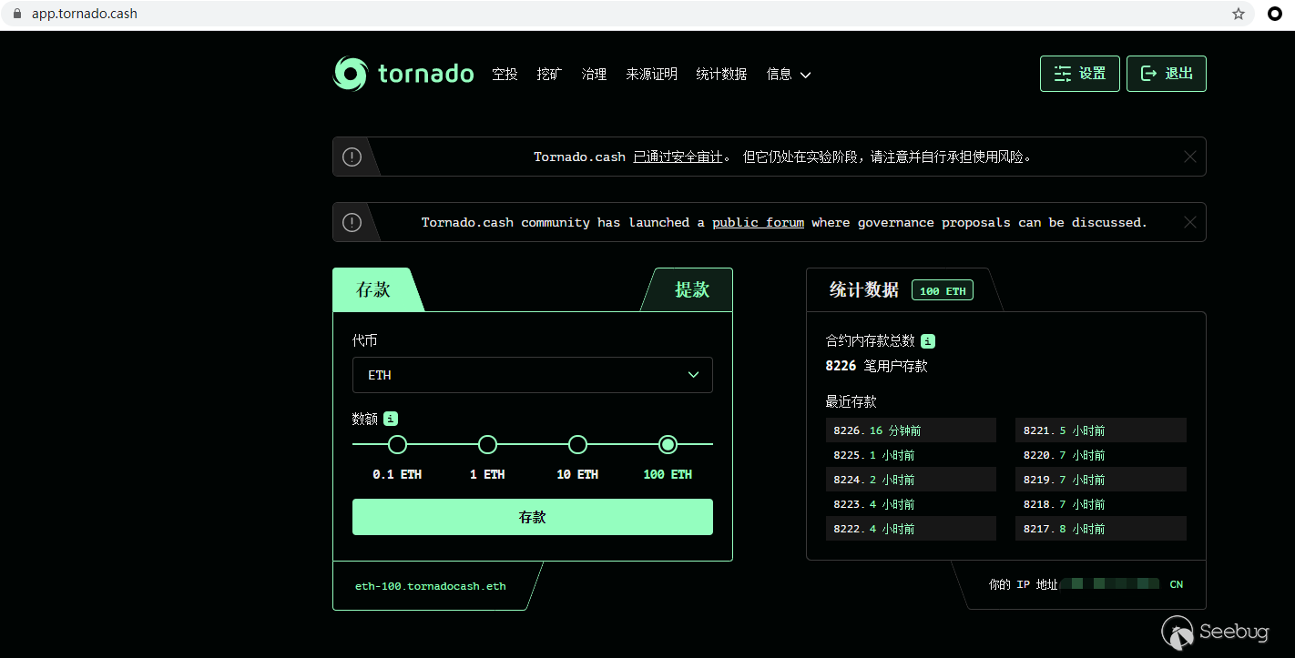 Tornado.cash 可帮助你收回隐私,以隐藏发送地址的方式将 Ether 发送到任何地址。通过零知识证明实现。你可以使用此应用将 ETH 存入非托管智能合约,然后轻松生成凭据来证明你已经执行了存款,但未透露原始地址。而后,取款时应用会将此证明发送给服务商,服务商会将其提交给智能合约,然后智能合约将 ETH 发送给所需的收件人,并向服务商支付少量费用。