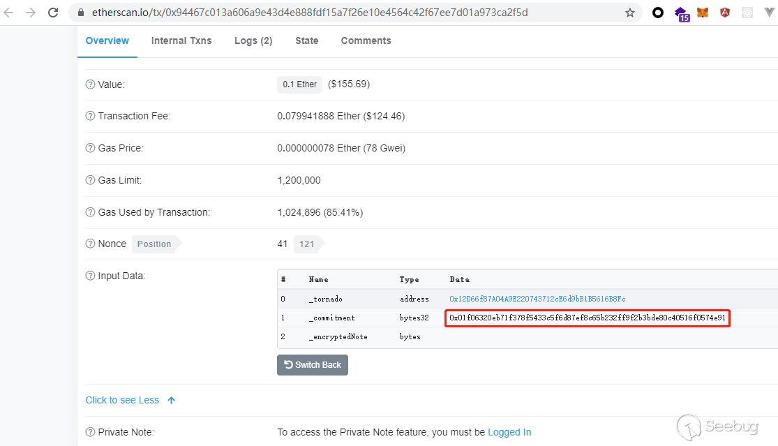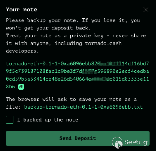 下链后通过 note 还原证明数据(_proof, [uint256(_root), uint256(_nullifierHash), uint256(_recipient), uint256(_relayer), _fee, _refund])),该凭据 note 是恢复你的 R(_Root)、h(_nullifierHash)、A(_recipient)、f(费用)、P(_proof) 的唯一方式,切不可丢失或遗忘。
