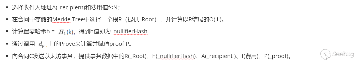 智能合约验证了_nullifierHash 散列的真实性和唯一性。在验证成功的情况下,它发送(N−f)到指定地址并将 h 置为 true 添加到哈希列表中。