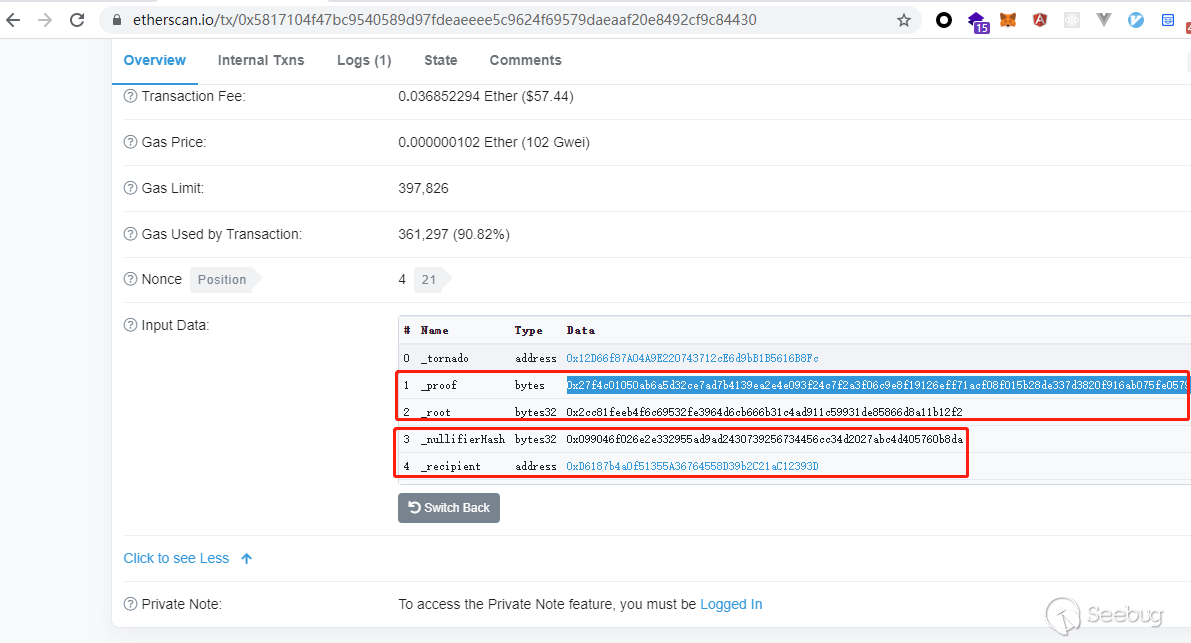 传入数据是根据存款后返回的 note 进行解密进行填入的,相当于在交易的过程中,你通过存币后返回的的_proof、_root、_nullifierHash 来证明了你的存款,这便是零知识证明的体现。