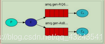 5、生产者发送的消息,经过交换机到达队列,实现一个消息被多个消费者获取的目的