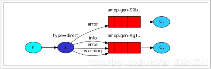 C2:消费者,其所在队列指定了需要 routing key 为 info、error、warning 的消息