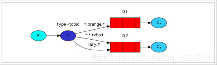 Topic:通配符,把消息交给符合routing pattern(路由模式) 的队列