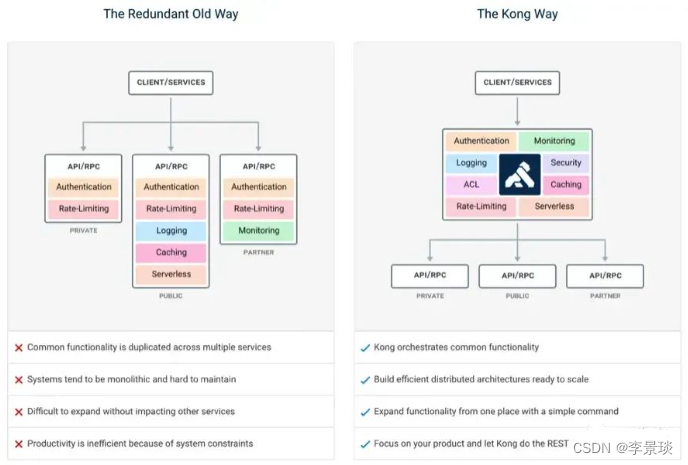 从下图可以看到 Kong 解决的问题。专注于全局的 Api 管理策略,全局流量监控、日志记录、全局限流、黑白名单控制、接入请求到业务系统的负载均衡等。