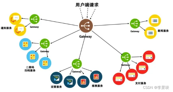下面图介绍了网关 (Gateway) 作用,可知 Gateway 方式下的架构,可以细到为每一个服务的实例配置一个自己的 Gateway,也可以粗到为一组服务配置一个,甚至可以粗到为整个架构配置一个接入的 Gateway。于是,整个系统架构的复杂度就会变得简单可控起来。