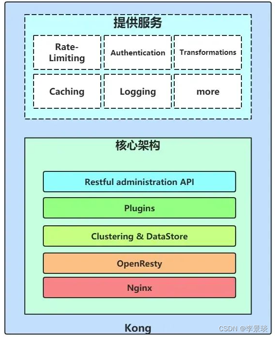首先最底层是基于 Nginx, Nginx 是高性能的基础层, 一个良好的负载均衡、反向代理器,然后在此基础上增加 Lua 脚本库,形成了 OpenResty,拦截请求, 响应生命周期,可以通过 Lua 编写脚本,所以插件比较丰富。