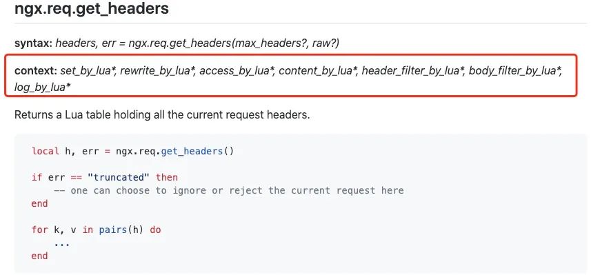 注意:OpenResty 的 API 有使用范围限制,每个 API 都有与之对应的使用阶段列表,如果你超范围使用就会报错。