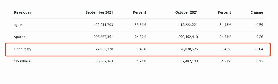OpenResty 现在全球排名第三,由于将 Nginx 扩展成动态服务器,发展势头很猛。