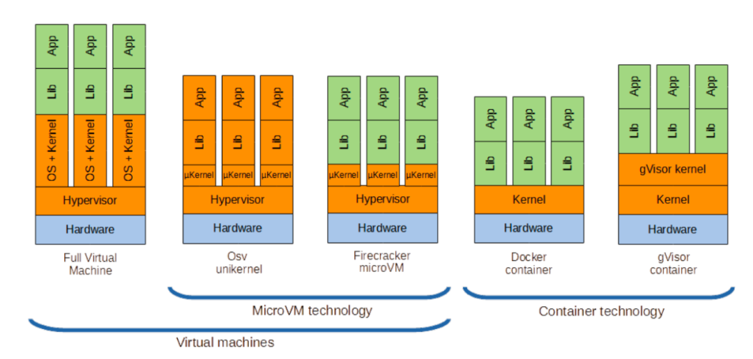 微内核容器,使用了 hypervisor,如 Firecracker、Kata-Container,也符合 OCI 规范,容器运行时为 runc 或 runv,有比较好的安全性和隔离性,性能介于标准容器和用户态内核容器之间