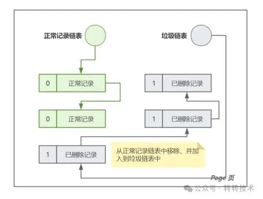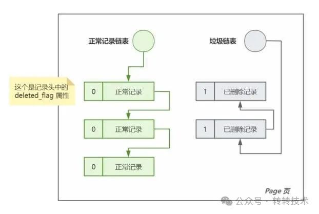 在深入分析问题原因之前先对 DELETE 操作的基本流程进行复习。众所周知,MySQL 以页作为数据的基本存储单位,每个页内包含两个主要的链表:正常记录链表和垃圾链表。每条记录都有一个记录头,记录头中包括一个关键属性——deleted_flag。
