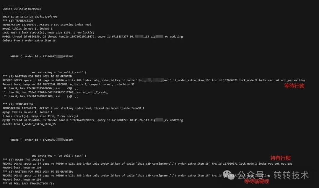 | 2. delete from t_order_extra_item_15 WHERE (order_id = xxx and extra_key = xxx) ) 等待获取记录锁( lock_mode X locks rec but not gap waiting) | ||