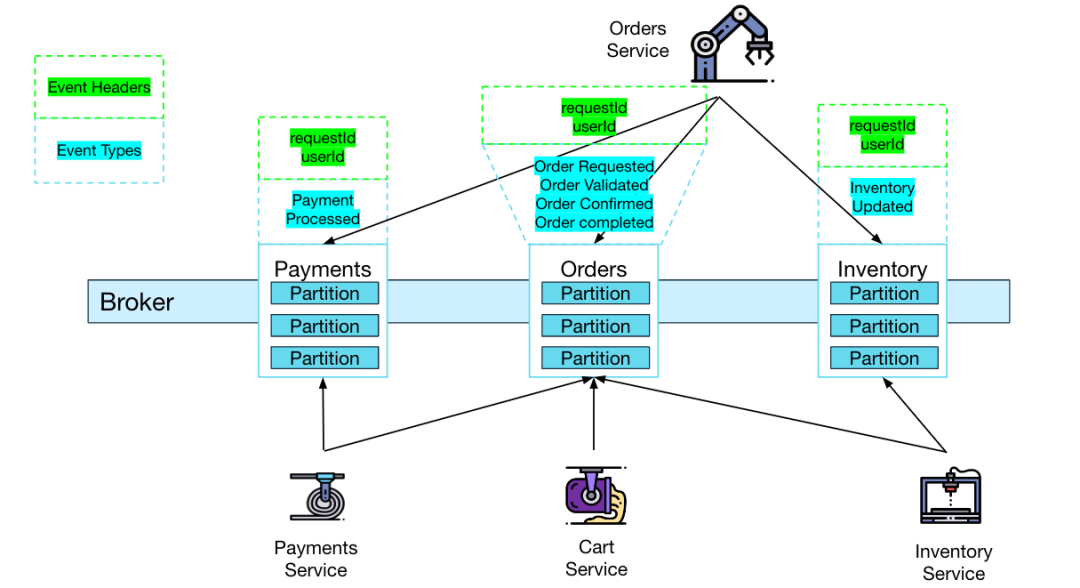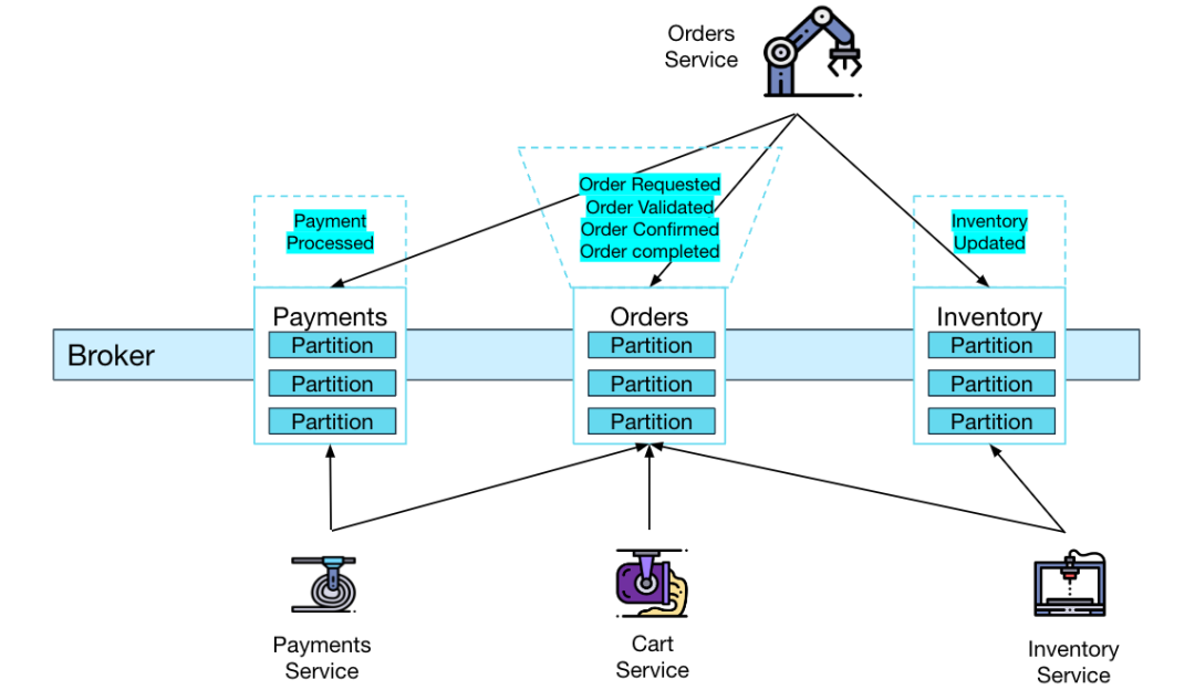 我们仍然以本文中使用的电子商务流程为例。订单服务必须使用多个来自 3 个不同主题的事件,这些事件都与同一个用户操作(在网商购买商品)相关。