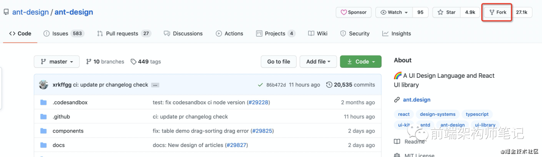 在 github 上找到你想要参与的开源项目 (这里以 ant-design 为例),然后点击右上角的 fork 按钮,就会在你自己的代码仓库中创建一个此开源项目的副本,后续所有代码提交都提交到此仓库,这样就不必担心未经审核的代码弄乱了原始仓库。