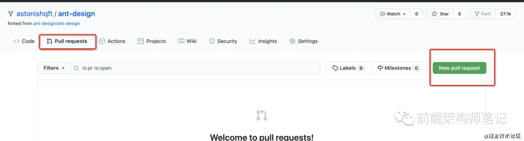 打开 github 上 fork 的开源项目,创建一个 pull request。