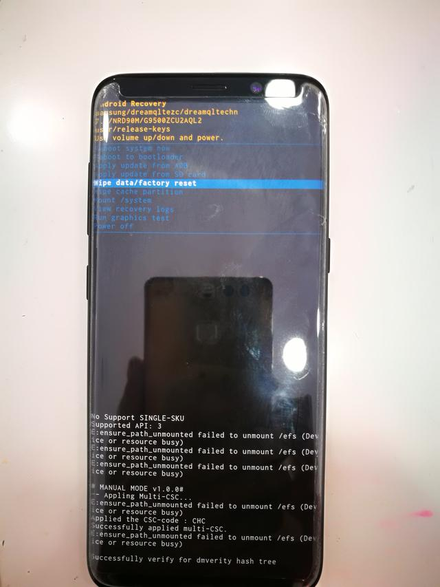 这时候要快速按住手机音量上键+BIXBY键(手机做侧音量键下面的那个键就是BIXBY键)+电源键进入RECOVERY.这个模式可以升级也可以双清清除密码。