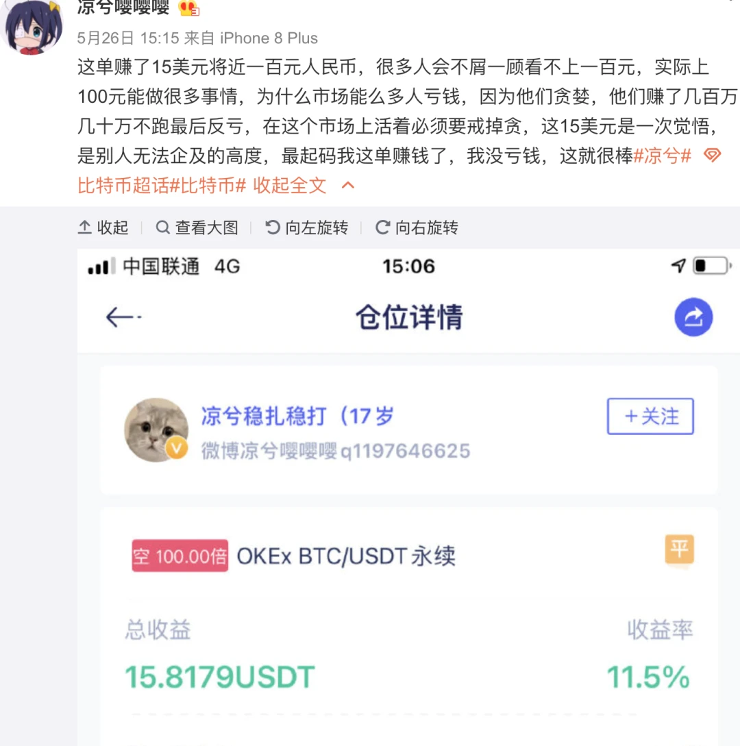 恋爱中的年轻人,总是沉浸于爱情的喜悦。千万级的损失,并不能让这个 18 岁的少年后悔。“她并不知道我跟她谈了一场 2500 万的恋爱,就连止损前一分钟都还在哄她,宝贝你是不会知道我有多爱你。” 在微博上,凉兮这样公开表示。