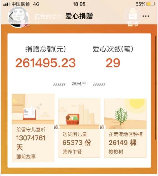 在 2021 年六月中旬,凉兮开始了频繁的捐款活动。抗战老兵、助学计划、留守老人…… 凉兮在支付宝与微信高频捐献,目前总额已超数十万。且热衷于发红包,经常在微博为粉丝发数千甚至上万元的红包。
