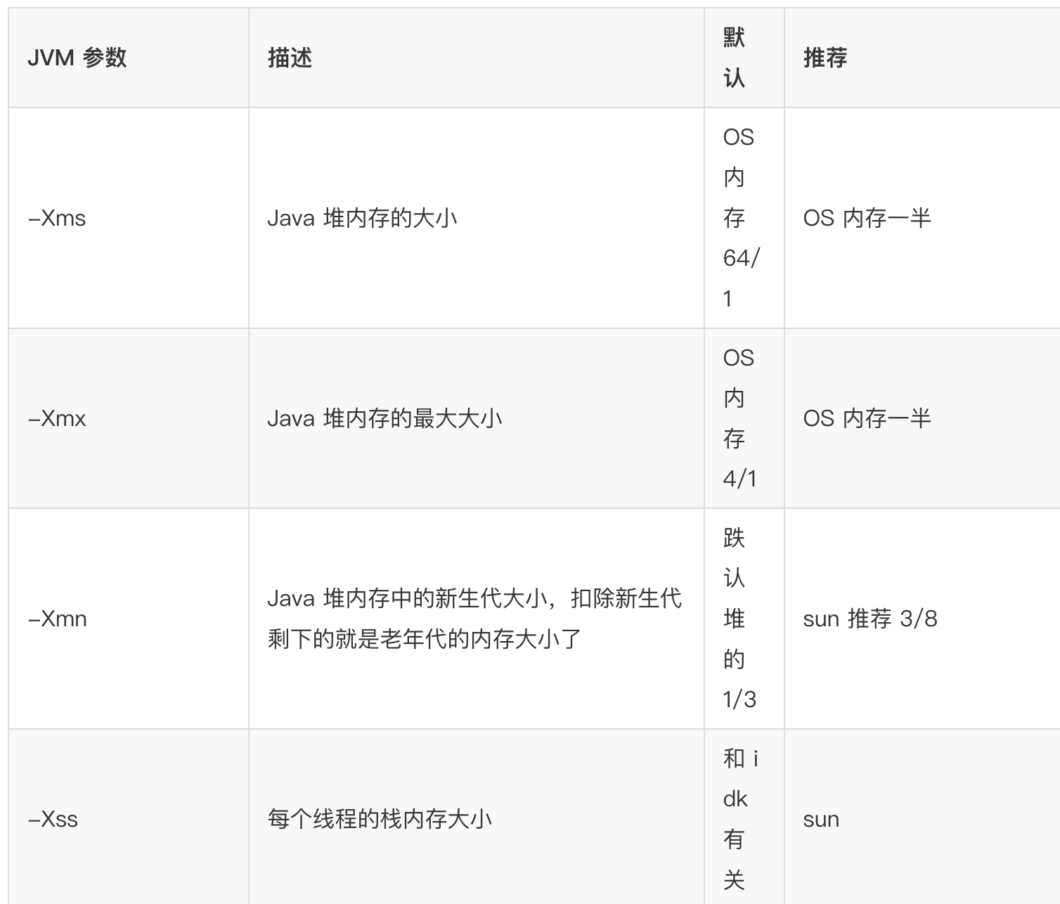 首先,JVM 最重要最核心的参数是去评估内存和分配,第一步需要指定堆内存的大小,这个是系统上线必须要做的,-Xms 初始堆大小,-Xmx 最大堆大小,后台 Java 服务中一般都指定为系统内存的一半,过大会佔用服务器的系统资源,过小则无法发挥 JVM 的最佳性能。