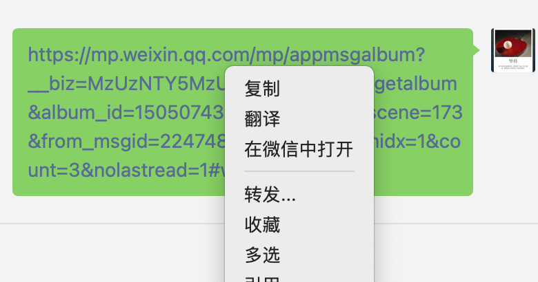 miller 发布于 2022-10-21 11:13:40 提取微信文章 长链接 变短连接 举例: https://mp.weixin.qq.com/mp/appmsgalbum?__biz=MzUzNTY5MzU2MA==&action=getalbum&album_id=1505074355683278852&scene=173&from_msgid=2247485736&from_itemidx=1&count=3&nolastread=1#wechat_redirect 复制发送到微信, 比如自己发给自己, 右击链接, 在微信中打开 (PC端) 复制网址 变成如下: https://mp.weixin.qq.com/s/eemPstgUB6hq4BumVxBFQA 历史 浏览 (2861) 点赞 收藏