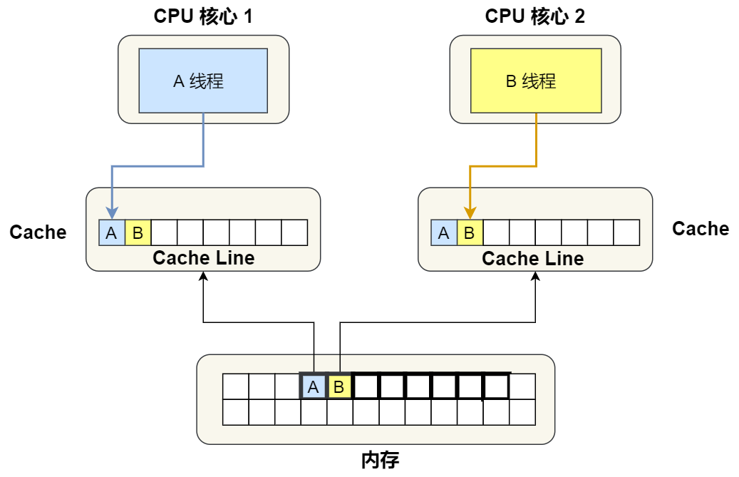 现在假设有一个双核心的 CPU,这两个 CPU 核心并行运行着两个不同的线程,它们同时从内存中读取两个不同的数据,分别是类型为 long 的变量 A 和 B,这个两个数据的地址在物理内存上是连续的,如果 Cahce Line 的大小是 64 字节,并且变量 A 在 Cahce Line 的开头位置,那么这两个数据是位于同一个 Cache Line 中,又因为 CPU Line 是 CPU 从内存读取数据到 Cache 的单位,所以这两个数据会被同时读入到了两个 CPU 核心中各自 Cache 中。