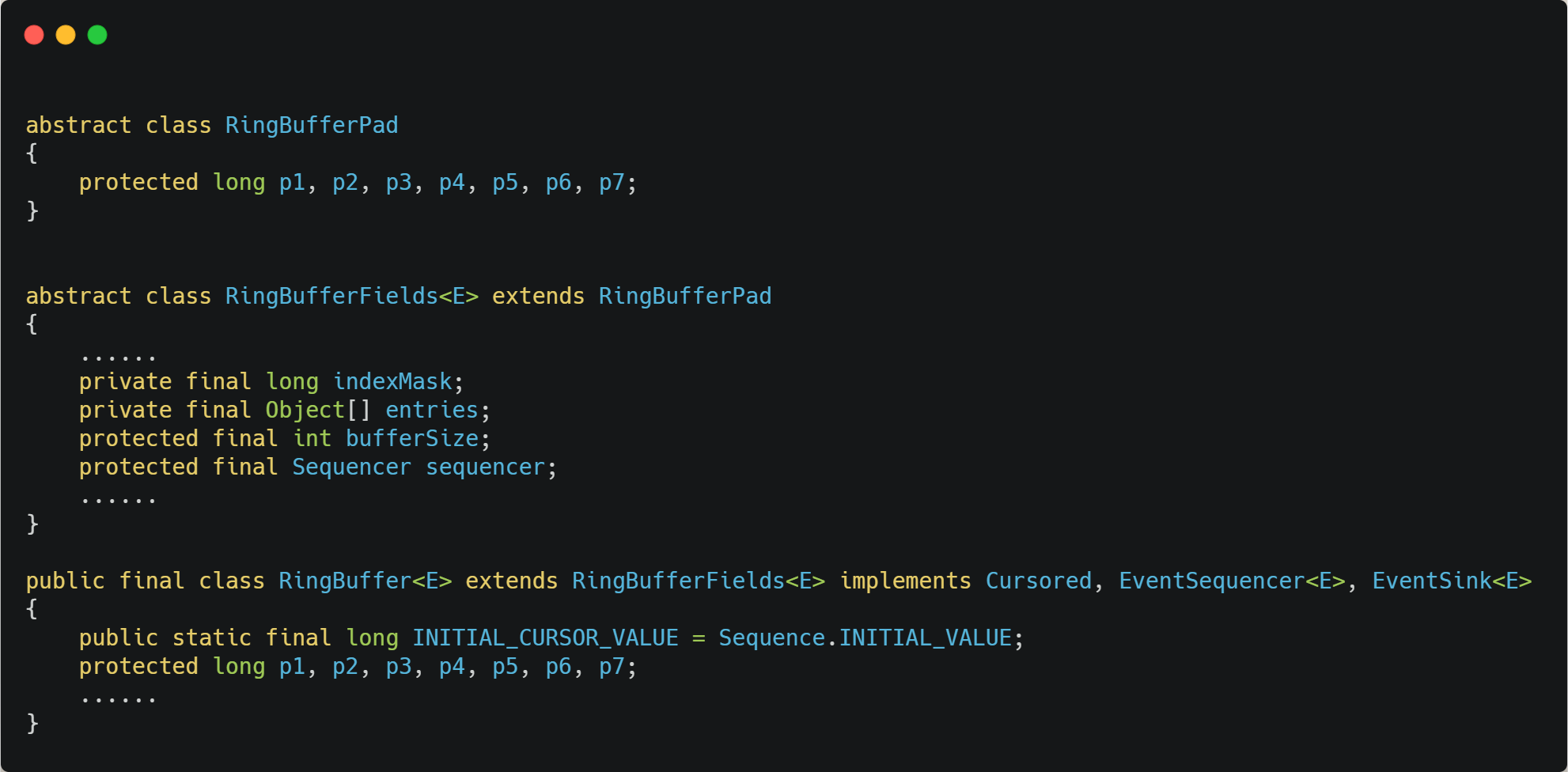 根据 JVM 对象继承关系中父类成员和子类成员,内存地址是连续排列布局的,因此 RingBufferPad 中的 7 个 long 类型数据作为 Cache Line 前置填充,而 RingBuffer 中的 7 个 long 类型数据则作为 Cache Line 后置填充,这 14 个 long 变量没有任何实际用途,更不会对它们进行读写操作。