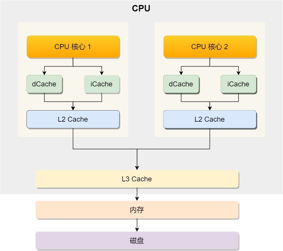 可以看到,一个 CPU 里通常会有多个 CPU 核心,比如上图中的 1 号和 2 号 CPU 核心,并且每个 CPU 核心都有自己的 L1 Cache 和 L2 Cache,而 L1 Cache 通常分为 dCache(数据缓存) 和 iCache(指令缓存),L3 Cache 则是多个核心共享的,这就是 CPU 典型的缓存层次。