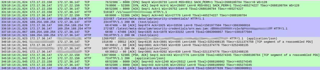但在两次交换之间,蓝色部分占用了 86 毫秒。这到底是怎么回事?在数据包 333,我们的服务向 / latest/meta-data/iam/security-credentials 发送了一项 HTTP GET 请求,而后在同一 TCP 连接上,又向 / latest/meta-data/iam/security-credentials/arn:… 发送了另一项 GET 请求。