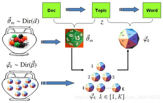 • 随机初始化,对当前文档中的每个词 w,随机地赋予一个 topic 编号 z。